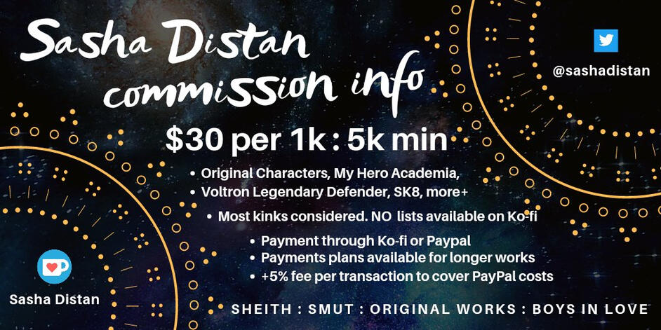 I will remain in contact with you throughout the writing process and provide ETAs and other updates.I will post the finished work to A03, unless discussed otherwise. I will gift the fic to your handle if you have one.I will not reveal you as a commissioner without permission if you wish to remain anonymous.I can also provide a digital copy of the commission as a pdf via email or discord.Commissions in excess of 20k include a professionally printed and bound paperback copy.I reserve the rights of ownership over all works. For OC fics, you retain all rights of ownership over your OCs and their specific settings.If your circumstances change and you need to cancel, refunds will only be issued if I have not yet started your commission. You are not expected to pay for “accidental” word count overage. Appropriate word counts will be discussed during the initial stages.Payment plans are available for longer commissions, but the 5% fee is applied to each transaction, as PayPal takes their cut every time.You can work as closely with me as is comfortable for you. I can provide outlines upon request.I reserve the right to refuse any commission on the grounds of comfort with the subject matter.Should the client decide to change or adjust the commissioned works through the use of machine learning or derived technologies (A.I. or ChatGPT etc), or create derivatives of the commissioned work through the use of machine learning or derived technologies, I will consider this an automatic purchase of exclusive rights. Standard fees for exclusive right will then be charged. Please enquire about the exclusive rights fee for your commission in advance to ensure adequate funds.